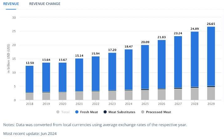 First, data shows that the total market size for meat sales in Indonesia is predicted to be around US$ 18.47 billion per year by 2024. And it is expected to continue growing, with a growth rate of 7.6% per year. For the meat sales industry, it can be divided into three segments: Fresh Meat, Vegan Meat, and Processed Meat (Corned/Canned Food). The revenue that can be generated per capita in 2024 is projected to reach US$ 66.00 or equivalent to IDR 1.024.254.